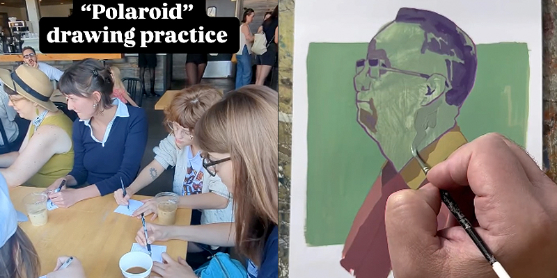 j’ai beaucoup aimé cette idée toute simple de dessiner entre ami.e.s dans un café. remarquez que les artistes autour de la table dessinent s’inspirent d’un carré polaroïd. cet exercice fait partie du projet «Hand Drawn Photo Booth», une idée pas banale de dessiner lors d’un événement un peu comme si les gens étaient dans un «photobooth». visitez leur site pour voir toutes les variantes de leur offre. il y a vraiment des gens qui veulent inclure la créativité partout et c’est magique.