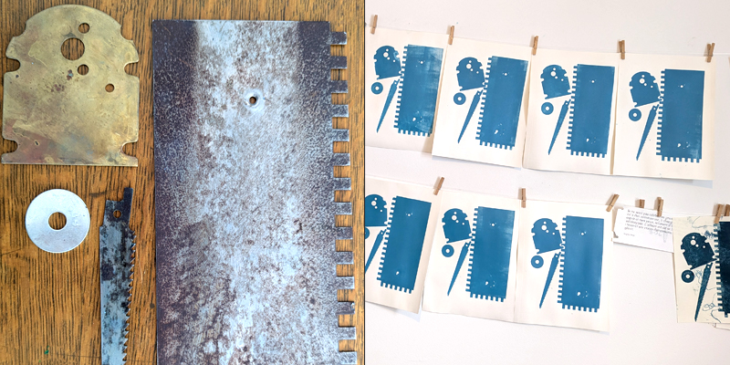 il y aussi l’échange de gravures qui est en cours. une levée de fonds pour d’encre et de papier, mais surtout le plaisir de recevoir huit gravures en retour. depuis la première édition, la qualité est au rendez-vous. le thème de cette année est «appareil». j’ai commencé cette semaine et j’ai imprimé ma première couleur, des formes de métal manufacturées trouvées ici et là. la date limite est le 3 avril. cette activité est ouverte à toutes et tous.