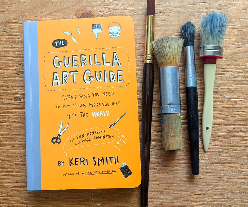 je vous parle aujourd’hui du livre « the guerilla art guide, everything you need to put your message out into the world». ce que j’aime des nombreux livres de Keri Smith (quelques-uns existent en français), c’est qu’elle nous pousse à l’action créative, une belle façon de manifester. on devrait créer plus souvent des interventions artistiques dans notre milieu de vie pour passer un message, que ce soit pour la gestion de la ville, pour les citoyennes et citoyens d’un quartier, tout est possible.