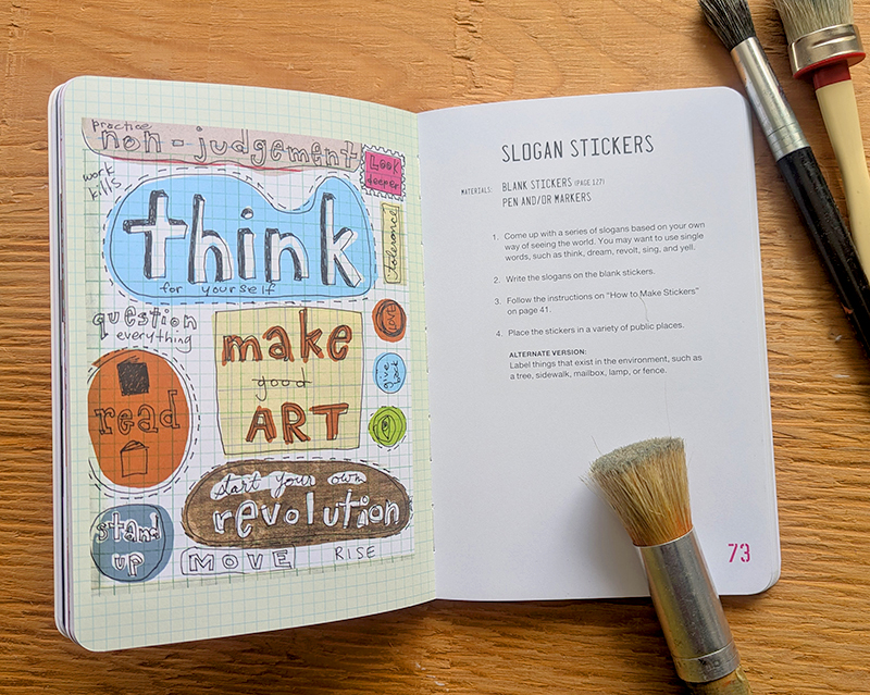 dans ce livre publié en 2025, l’artiste propose diverses façons de devenir une «guerilla artist», ce que j’aime beaucoup et que je ne fais pas assez. elle nous explique tout, comment commencer, faire des éléments de diffusion facile à imprimer et une longue série d’exercices ou de choses à faire, que ce soit par la carte postale, un arbre de souhaits ou des dessins à la craie dans l’espace public.