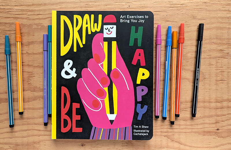 je vous présente aujourd’hui le livre «draw & be happy» de Tim A Shaw, illustré par Cachetejack. ce livre a été publié en 2018 et peut être difficile à trouver. vous pouvez en voir plusieurs pages ici.