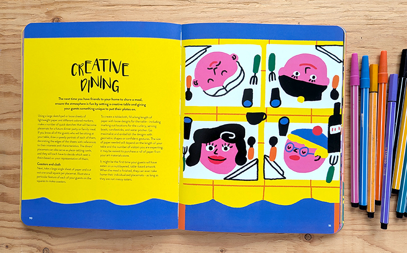 mais si vous pouvez mettre la main dessus, c’est un livre formidable pour se mettre à dessiner tous les jours pour sourire. j’ai adoré la façon dont le livre est structuré, toujours des double-pages très colorés qui proposent un prétexte à dessiner avec un petit texte d’explication ou de mise en contexte. que ce soit de faire une série infinie de cercles, de faire le portrait rapide de nos ami.e.s ou de dessiner sur le napperon alors qu’on est à table, à chaque suggestion, je souriais.