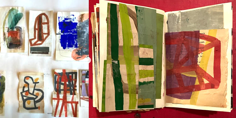 j’avais conservé ici un lien vers un de ses cahiers. elle remplit les pages, encore et encore. on parcourt ses récupérations de portions de gouache (?) sur toutes sortes de papier qui sortent souvent du cadre habituel. il y a ses harmonies de couleurs aussi. j’adore. sur son fil instagram elle présente souvent 5 ou 6 œuvres et les présente individuellement par la suite.