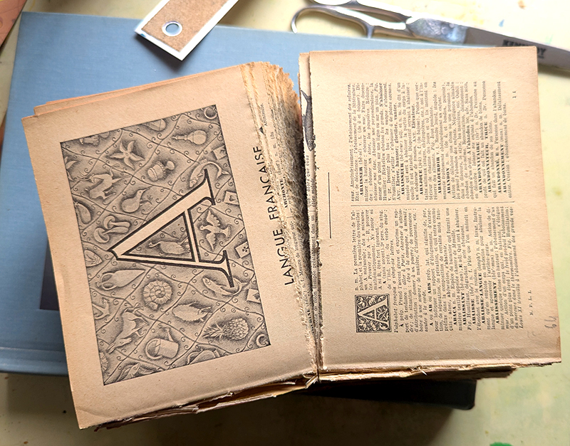 après mûre réflexion, j’en suis venue à une forme utilisant un livre coupé en deux. cette fois-ci, j’ai choisi un dictionnaire. dans ma collection de vieux livres, j’avais ce dictionnaire larousse de 1951. c’est celui-là que j’ai coupé en deux hier et dont une des moitiés sera elle aussi recoupée en plusieurs morceaux. cela m’a pris une journée ou deux de réflexion avant de me décider. j’ai souvent coupé des livres, mais couper un dictionnaire, ce n’était pas comme les autres bien que sa raison d’être soit en lien direct avec mon propos, partager la connaissance.