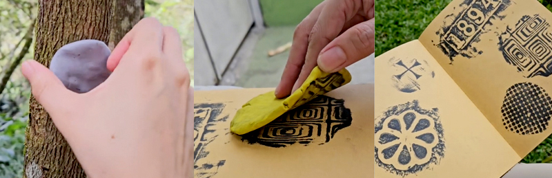 aujourd’hui, la pâte à modeler comme technique d’impression. c’est l’artiste Hiperbólica qui en présente plusieurs belles possibilités. ce que j’aime de cette technique (qui ressemble à du frottage aussi) est l’idée d’empreinte d’un lieu. le fait d’imprimer à partir d’un simple tampon d’encrage facilite tout le processus et se transporte partout. l’artiste nous en présente ici un exemple lors d’un passage au jardin botanique, ou ici dans une visite de la ville.