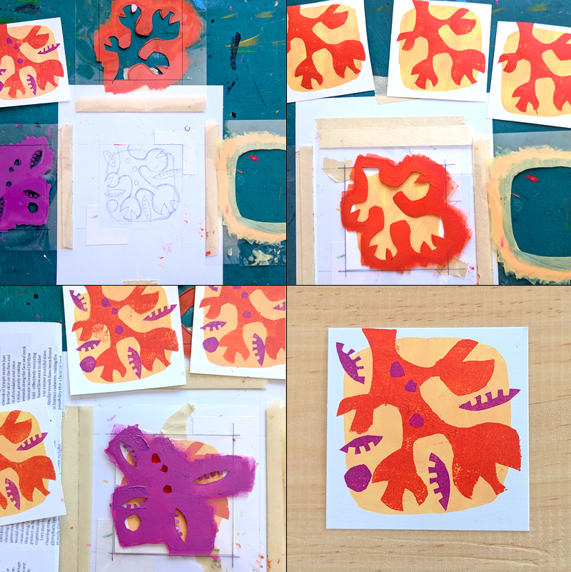 j’ai fait mon dessin, placé mes trois acétates dans lesquels j’ai coupé les formes que je voulais imprimer. c’est très très loin d’être précis et c’est ce que j’aime.