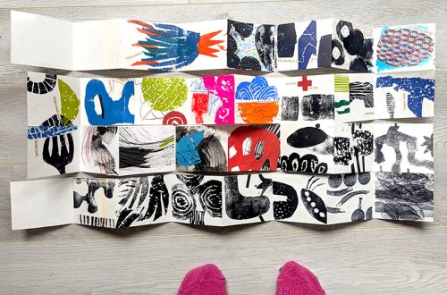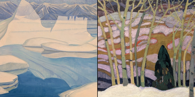 en haut, détail de tableaux de Doris McCarthy et Anne Savage.