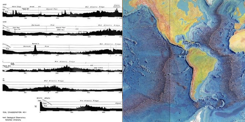 je voudrais souligner le travail de la cartographe américaine Marie Tharp. cette musicienne et géologue de formation a dessiné les cartes sous-marines dans un bureau, sans aller en mer. elle a commencé ce travail en 1948, alors que les lectures des profondeurs marines étaient, somme toute, loin de la précision des outils d’aujourd’hui. c’est à la lecture des rapports qu’elle est parvenu à dessiner les fonds marins.